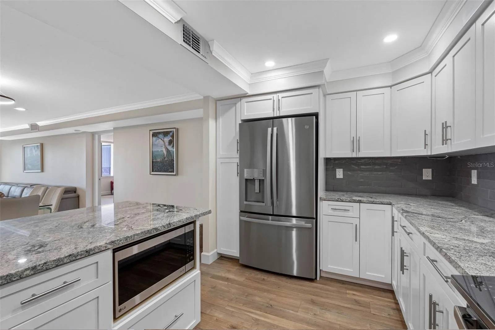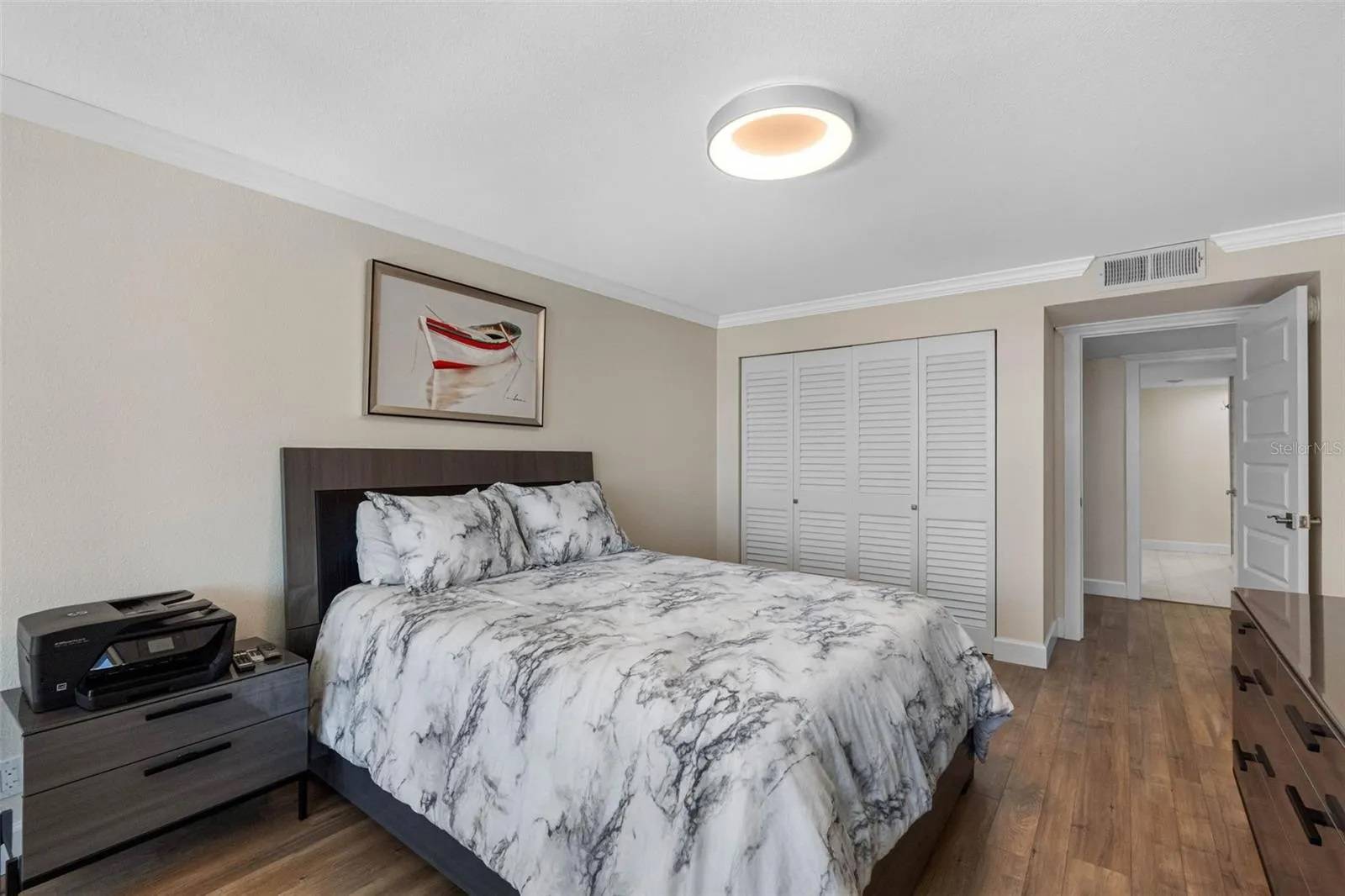 Everything feels brand new in this high-end renovation that includes beautiful laminate plank flooring that flows seamlessly throughout, crown molding, 5-inch baseboards, new interior doors, electric blinds, and all new fixtures. There are also upgraded floor to ceiling sliding doors that access a spacious balcony with captivating views of the beach, Gulf, and Intracoastal Waterway. All doors are protected by electric roll down hurricane shutters. The kitchen is a masterpiece with gorgeous granite countertops, ceramic backsplash, recessed ambient lighting, and stainless-steel GE Profile appliances. Custom Shaker wood cabinets with brushed satin nickel hardware and soft-close drawers frame in this wonderful space. Both baths are beautifully updated with granite countertops, elegant tile work, and upscale fixtures. The owner’s retreat is a spacious sanctuary that features floor to ceiling sliding doors that access the balcony, dual closets, and en suite bath with dual sinks and upgraded resort-style shower. This property also comes with a premium under building parking space and storage locker for your beach toys. South Beach II is a premiere gated community that is situated on one of the most pristine beaches that Florida has to offer. Manicured grounds and lush tropical landscaping create a carefree and welcoming environment. Enjoy breathtaking sunsets from the Tiki huts and swim in the heated resort-style pool that overlooks the Gulf. Other amenities include a Club Room, newly updated fitness room, onsite manager, and free membership to the Clearwater Community Sailing Center. Close to great restaurants, shops, entertainment and the Jolley Trolley! Call now to schedule your tour! Virtual tours are also available.
